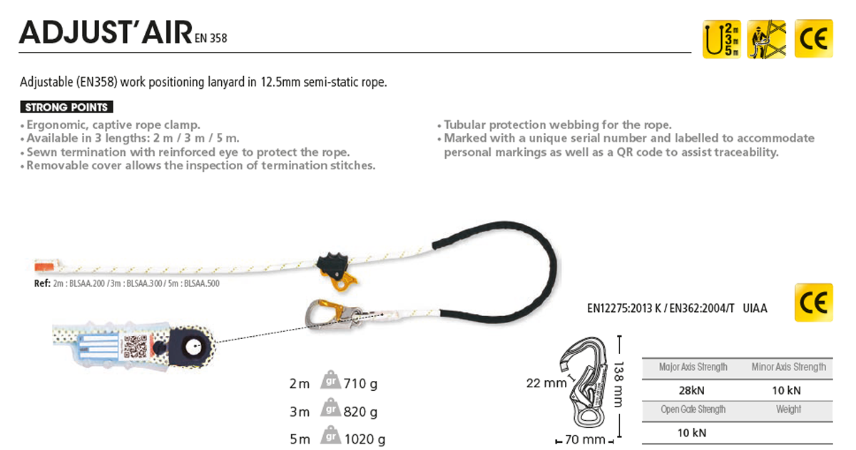 Adjustable (EN358) work positioning lanyard in 12.5mm semi-static rope.