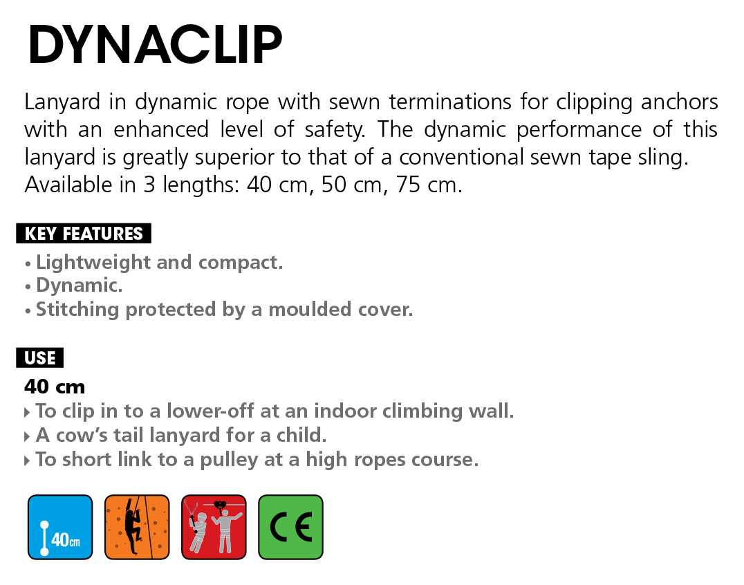 Lanyard in dynamic rope with sewn terminations for clipping anchors with an enhanced level of safety. The dynamic performance of this lanyard is greatly superior to that of a conventional sewn tape sling. Available in 3 lengths: 40 cm, 50 cm, 75 cm.
